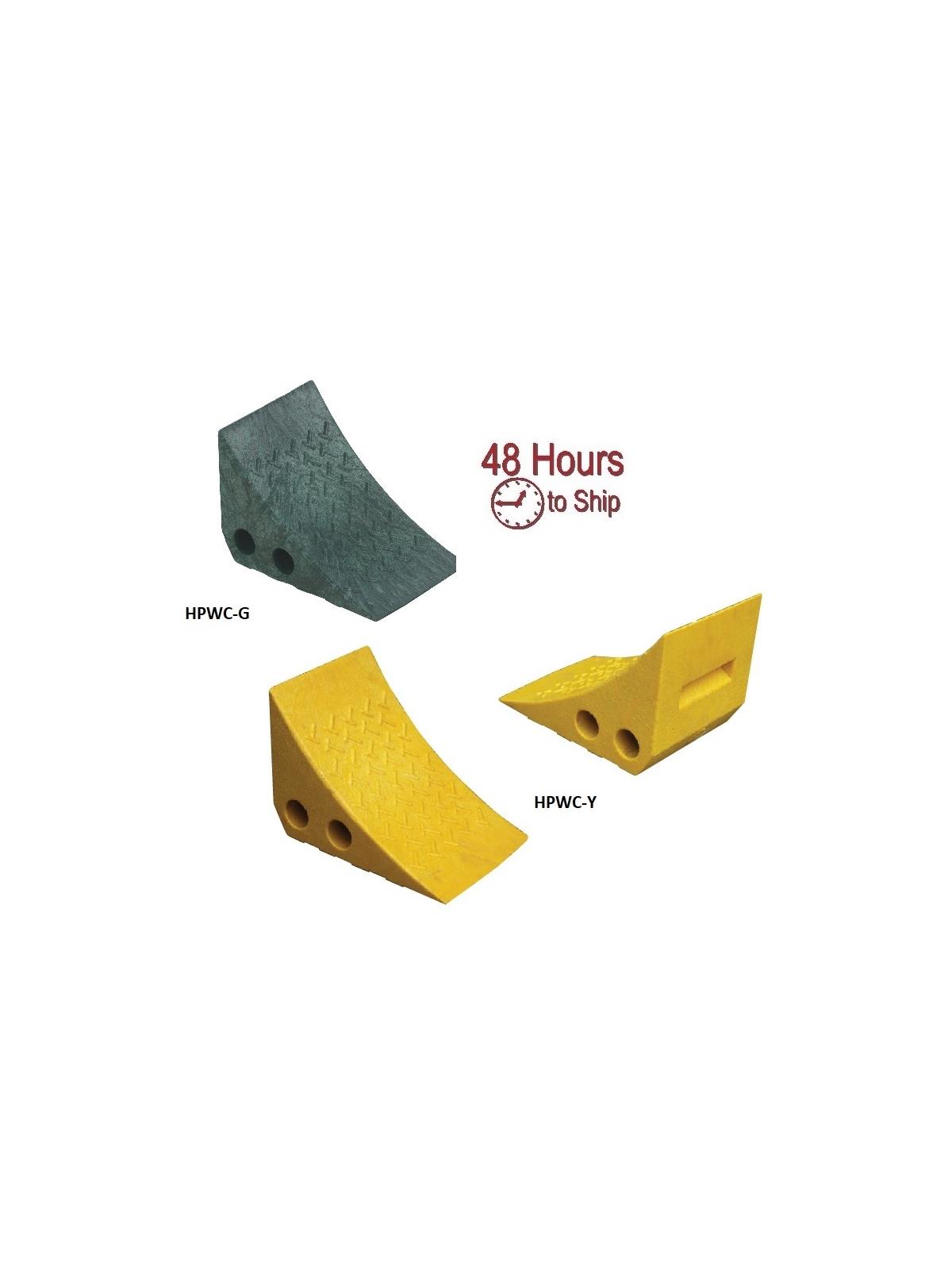 These plastic wheel chocks are durable yet light enough to take along when you travel. Made of 100% recycled plastic. Resistant to damage from sunlight, oil, salt and chemicals. FOB Shipping Point.