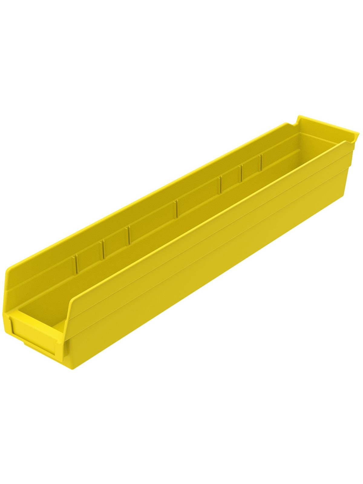 Outlasts corrugated bins - pays for themselves in reduced replacement costs. One-piece construction is waterproof and unaffected by grease or oil. Works with 12", 18" and 24" deep shelving, or vertical storage and retrieval units. Labels available. Available in 22 sizes and five colors - Red, Yellow, Blue, Green, or Semi-Clear. FOB Shipping Point.