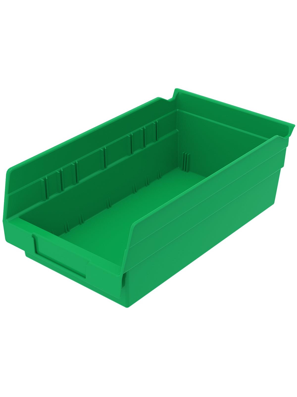 Outlasts corrugated bins - pays for themselves in reduced replacement costs. One-piece construction is waterproof and unaffected by grease or oil. Works with 12", 18" and 24" deep shelving, or vertical storage and retrieval units. Labels available. Available in 22 sizes and five colors - Red, Yellow, Blue, Green, or Semi-Clear. FOB Shipping Point.