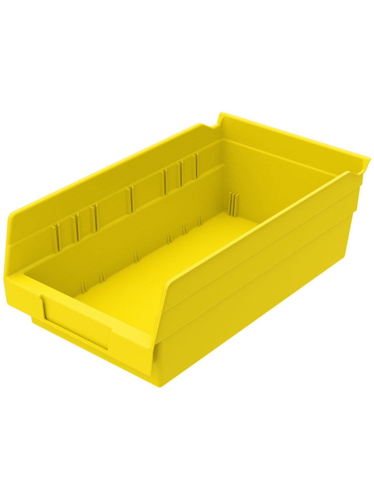 Outlasts corrugated bins - pays for themselves in reduced replacement costs. One-piece construction is waterproof and unaffected by grease or oil. Works with 12", 18" and 24" deep shelving, or vertical storage and retrieval units. Labels available. Available in 22 sizes and five colors - Red, Yellow, Blue, Green, or Semi-Clear. FOB Shipping Point.