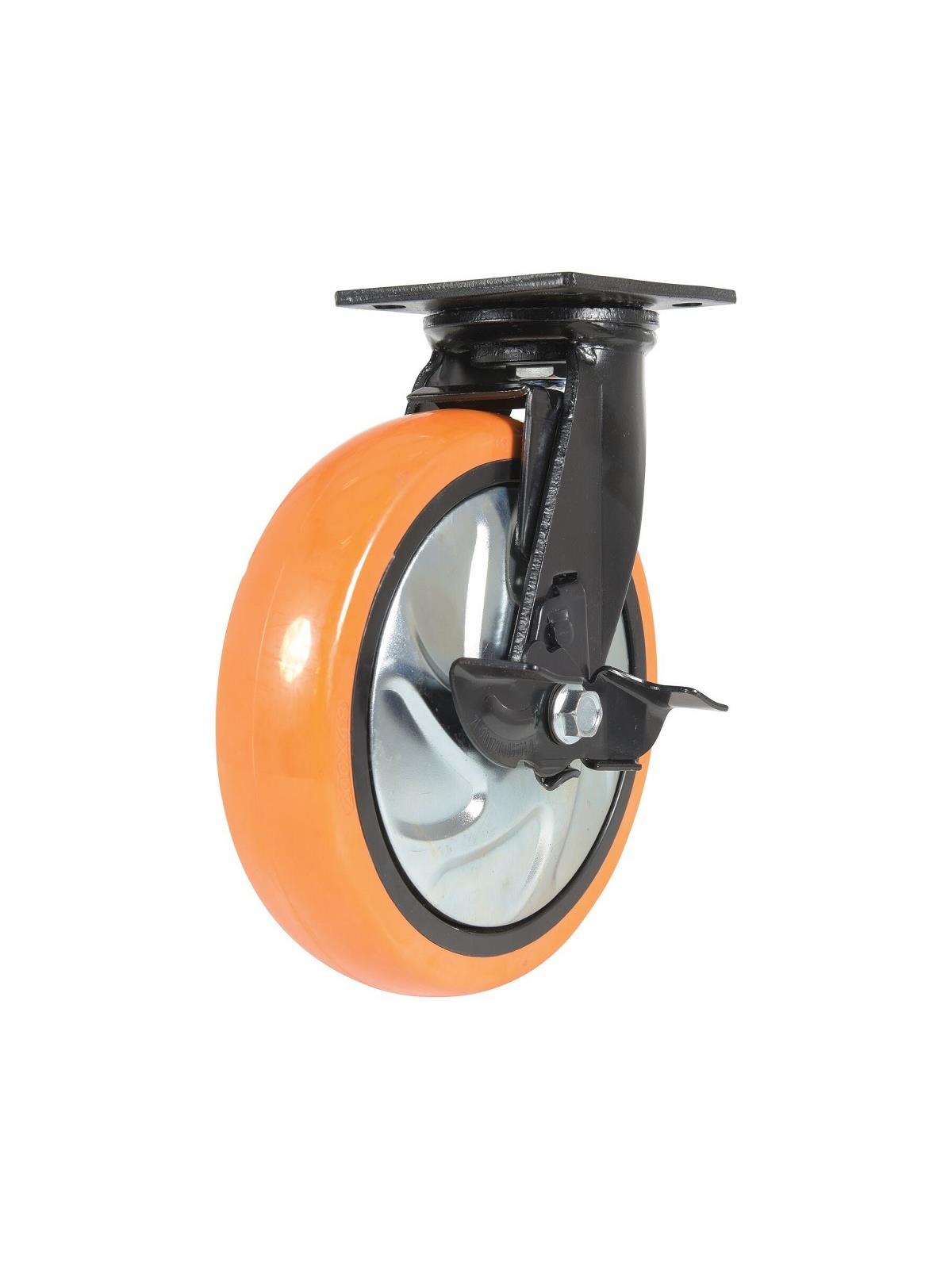 The perfect asset for an assortment of commercial and non-commercial settings. Swivel design allows the user to maneuver and change directions instantaneously. Wheel core is made of polypropylene. 95 /-5 Shore A. FOB Shipping Point.