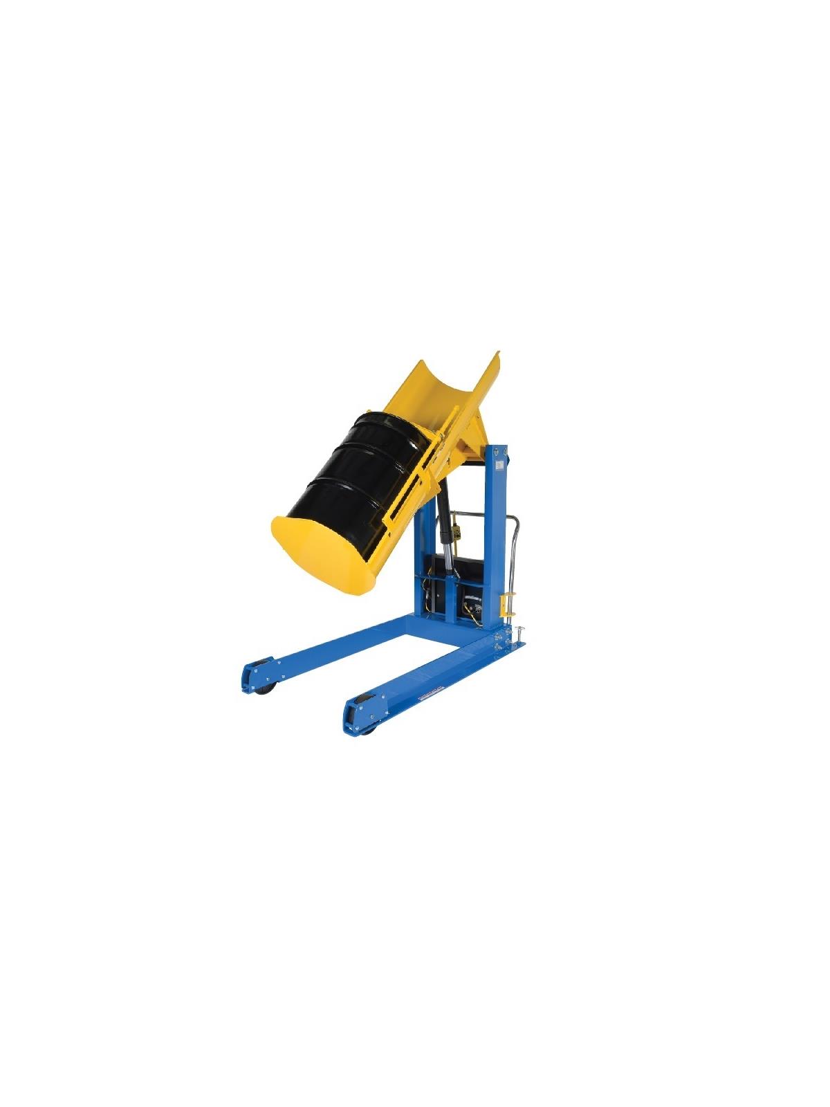 Hydraulic Drum Dumpers work with 30 and 55 gallon plastic, steel, and fiber drums. The unit has a solid steel chute. Portable units have two (2) rigid and two (2) swivel casters with floor lock screws. All steel construction. Standard features include: 56" frame, 3/4" HP motor, 115V single phase, 60hz. Upper travel limit switch, safety velocity fuse in cylinder, and vertical adjustment drum restraints are standard. Dumper is operated with a hand held control on a standard 8 ft. long coil cord. Frame, blue and chute, yellow baked-in powder-coated toughness.