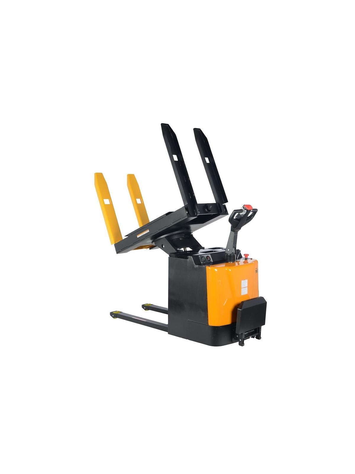 Tilt (powered) and rotate (manual) loads with our durable Pallet Inverters. Low profile design allows the operator to stand on the rider platform and steer the load from workstation to workstation quickly and easily. DC power lift and drive makes operation safe and efficient. The ergonomic handle features easy to operate throttle with infinite forward and reverse speeds, tilt/lower controls, safety belly reverse button, and horn. Features an electromagnetic disc brake with automatic dead-man feature that activates when user releases handle. Includes (4) 6V batteries, an on-board battery charger, battery level gauge, emergency battery disconnect, and horn. Ideal in loading dock areas as a powered pallet truck, powered pallet tilter, or as a manual turntable. Rolls smoothly on polyurethane steer and load wheels. FOB Shipping Point.