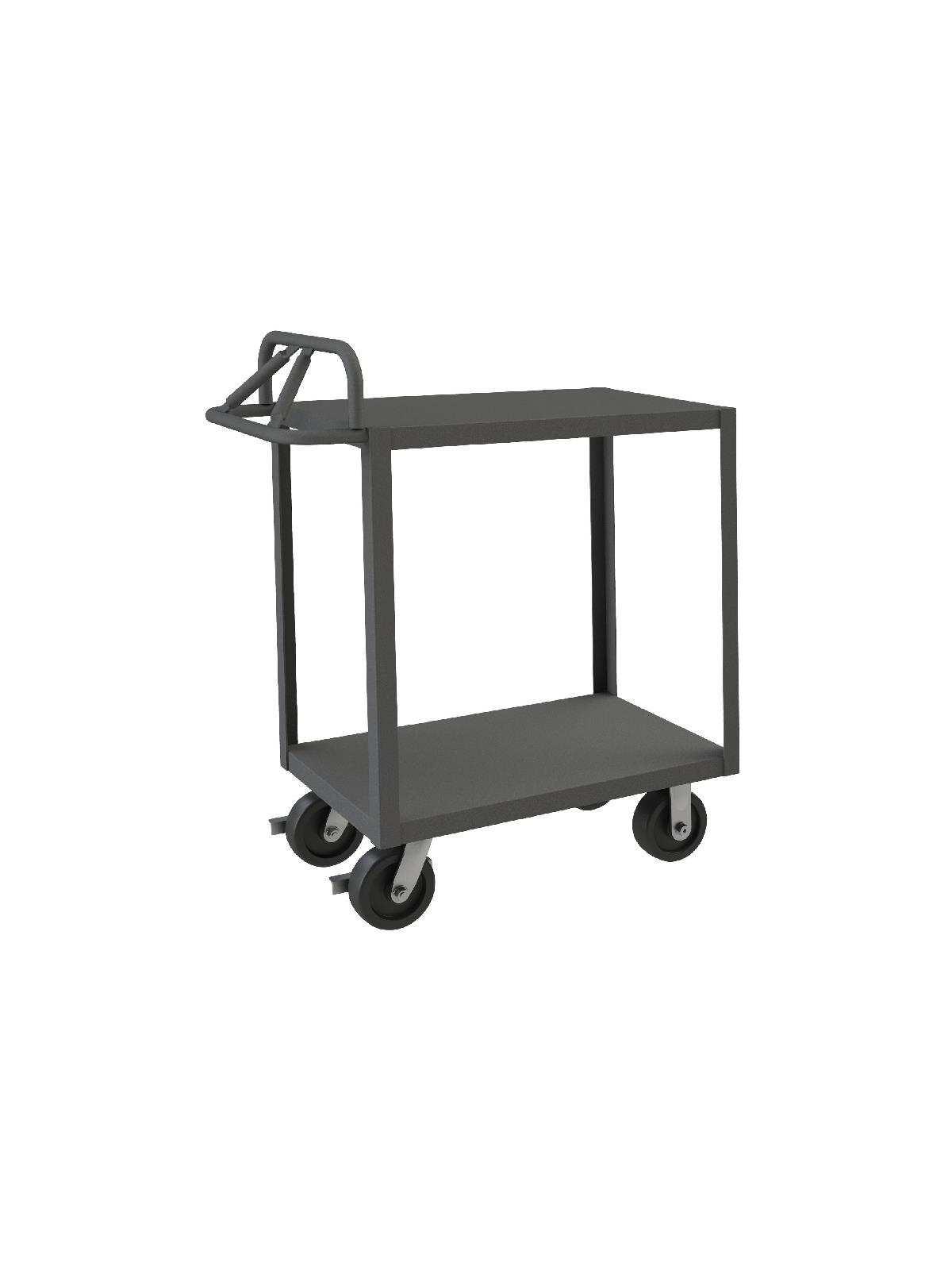 Constructed with 1-1/2" x 1/8" angle iron uprights for added strength. Heavy duty 14 gauge steel shelves. Sturdy, tubular, ergonomic handle has 3 positions ensuring maximum comfort. Standard units have 1-1/2" lips. ALD units have all lips down, TLD units have top lips down. Durable, gray, textured powder coat finish. FOB Shipping Point.