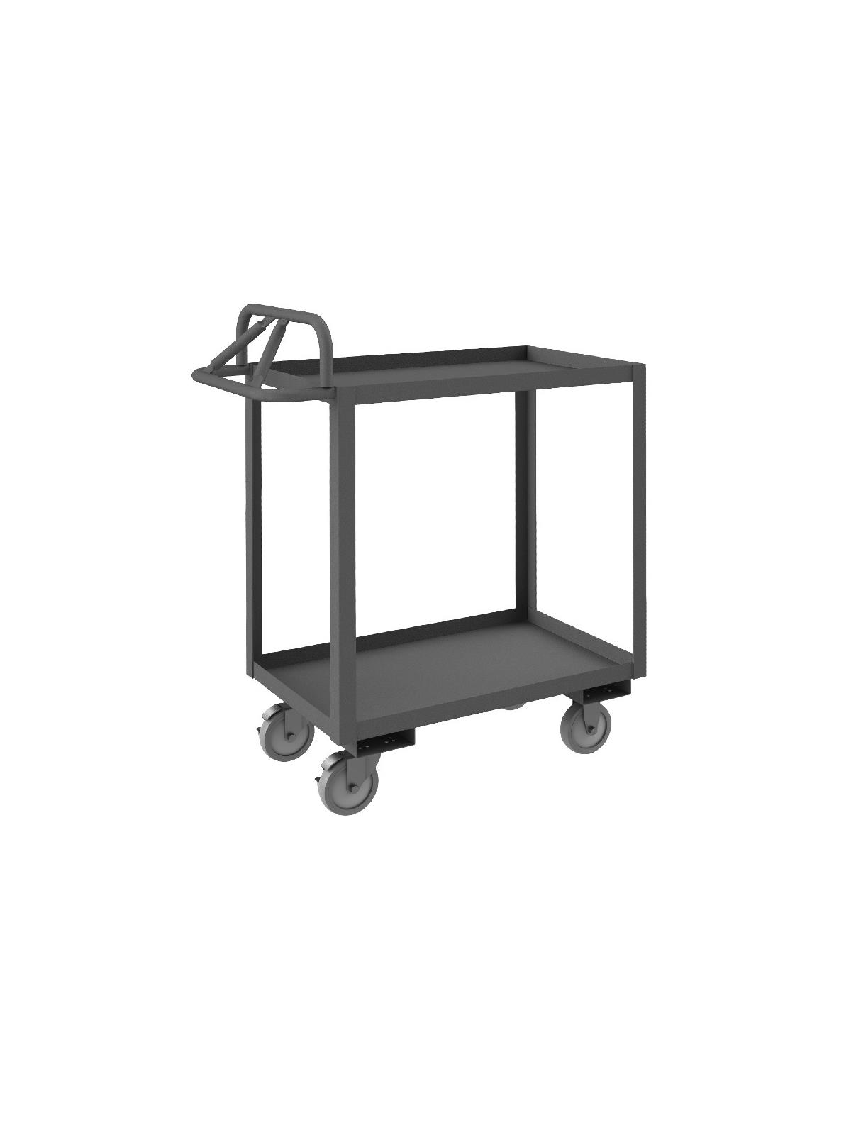Constructed with 1-1/2" x 1/8" angle iron uprights for added strength. Heavy duty 14 gauge steel shelves. Sturdy, tubular, ergonomic handle has 3 positions ensuring maximum comfort. Standard units have 1-1/2" lips. ALD units have all lips down, TLD units have top lips down. Durable, gray, textured powder coat finish. FOB Shipping Point.