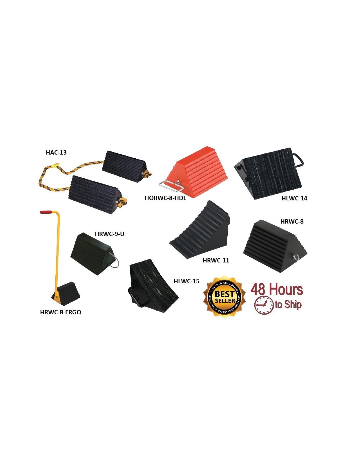 Constructed of reinforced rubber to provide a sure grip to virtually any surface. Curved surface contours to fit tires. Rubber resists tearing, abrasion, ozone weathering, etc. Functional design is durable in all weather conditions. Series HRWC-8 is constructed of a mix of virgin and recycled, no reinforcement cords. The Airline Chock is suitable for small and large aircraft. Model HAC-13 includes a 36" polypropylene rope between two chocks. FOB Shipping Point.