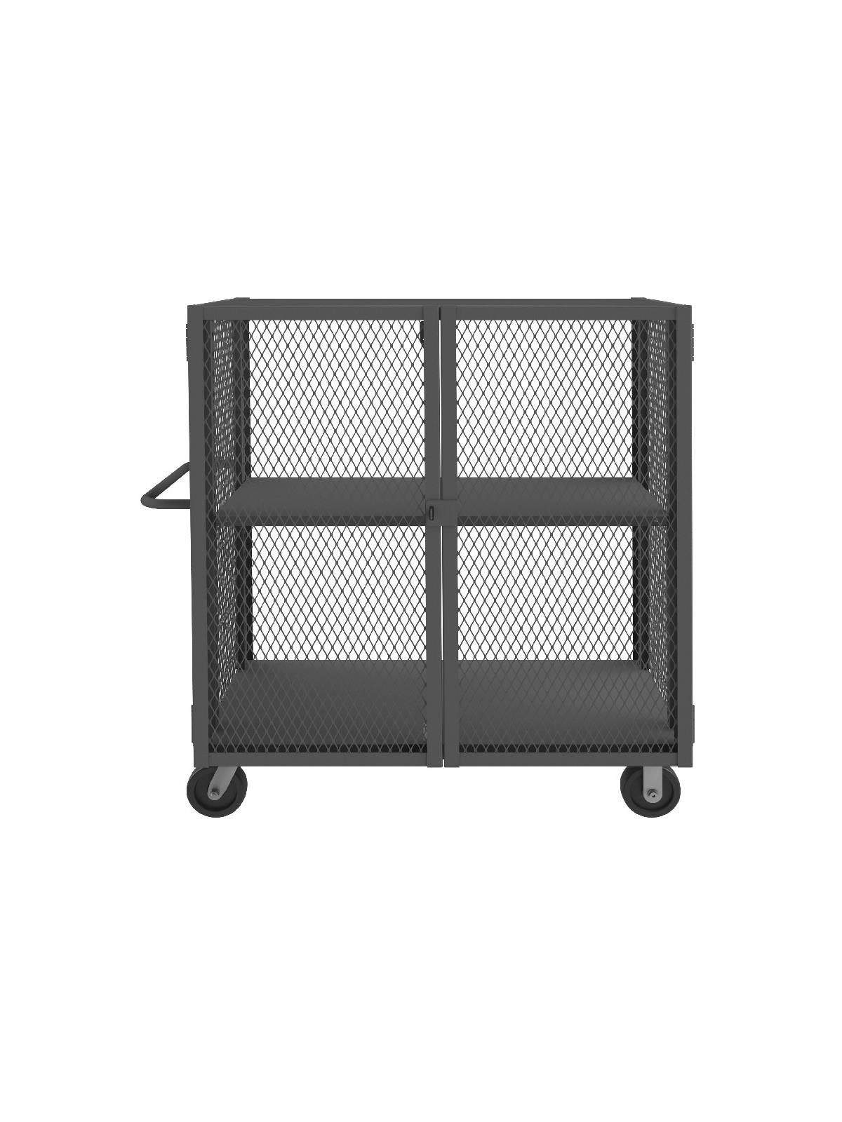 14 gauge steel construction. Punched diamond pattern on sides and front. Interior storage area is 48"H. 3-point handle has provisions for pad-lock (pad-lock not included). Rolls on 6" x 2" phenolic bolt-on casters, (2) swivel, and (2) rigid. Durable, textured gray powder coat finish. Includes one adjustable shelf. FOB Shipping Point.