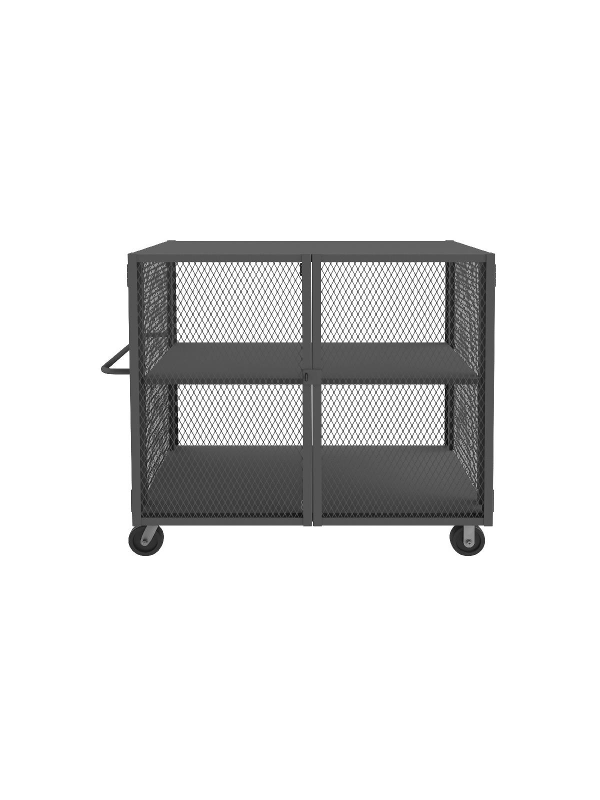 14 gauge steel construction. Punched diamond pattern on sides and front. Interior storage area is 48"H. 3-point handle has provisions for pad-lock (pad-lock not included). Rolls on 6" x 2" phenolic bolt-on casters, (2) swivel, and (2) rigid. Durable, textured gray powder coat finish. Includes one adjustable shelf. FOB Shipping Point.