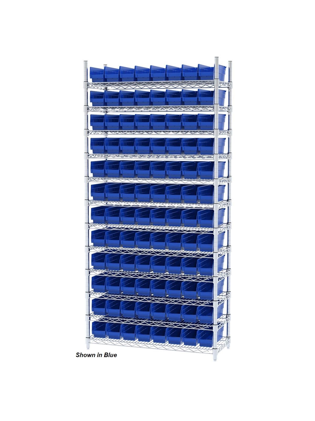 Shelf Bin Wire Systems can be configured for use with 36, 48, 60 or 96 bins providing a versatile system for storage and material handling. Durable and strong polypropylene shelf bins outlast corrugated bins. Bins available in Blue, Red, Yellow, or Semi-Clear. FOB Shipping Point.