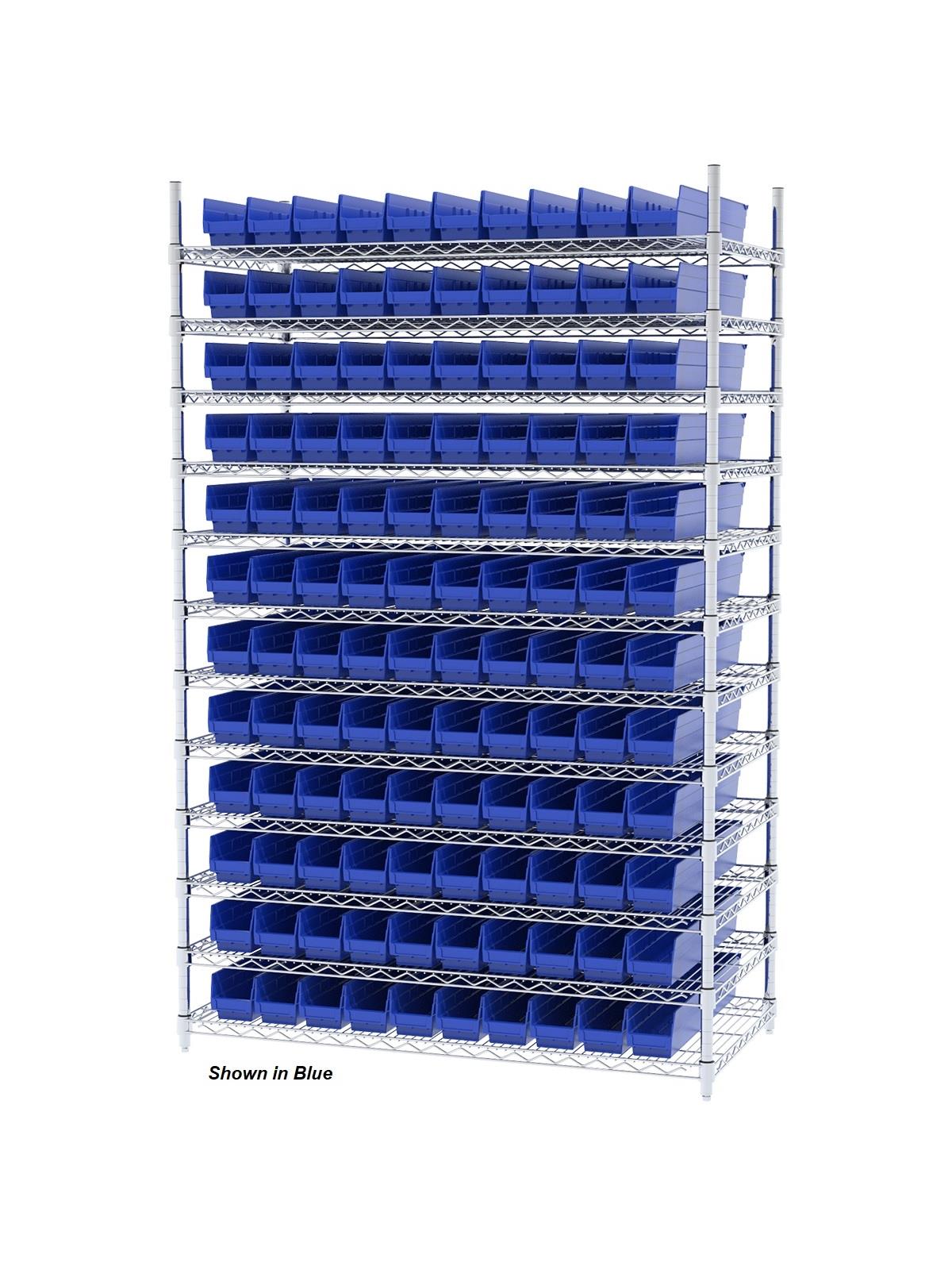 Shelf Bin Wire Systems can be configured for use with 36, 48, 60 or 96 bins providing a versatile system for storage and material handling. Durable and strong polypropylene shelf bins outlast corrugated bins. Bins available in Blue, Red, Yellow, or Semi-Clear. FOB Shipping Point.