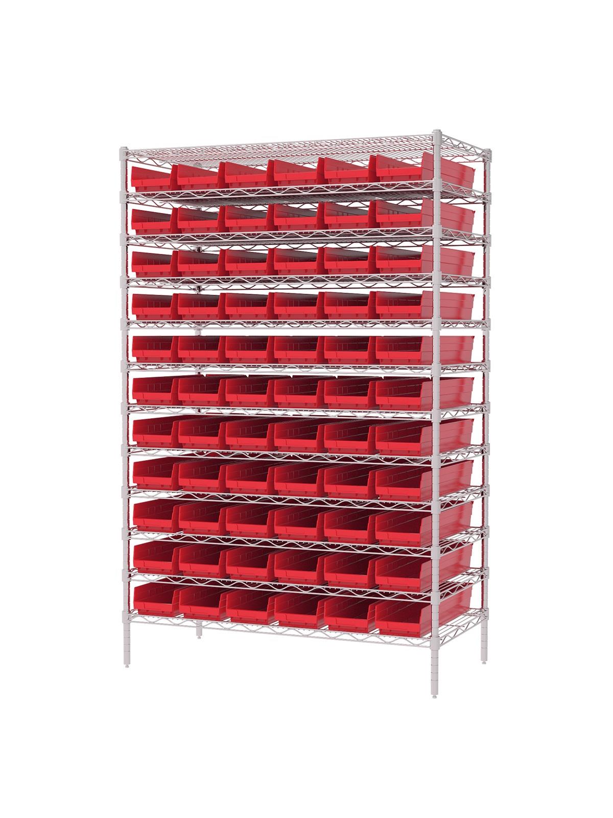 Shelf Bin Wire Systems can be configured for use with 36, 48, 60 or 96 bins providing a versatile system for storage and material handling. Durable and strong polypropylene shelf bins outlast corrugated bins. Bins available in Blue, Red, Yellow, or Semi-Clear. FOB Shipping Point.