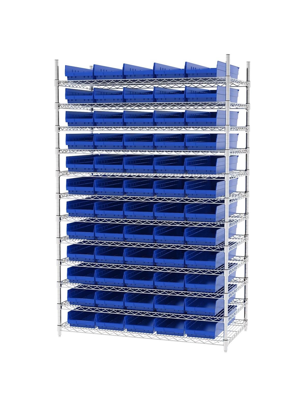 Shelf Bin Wire Systems can be configured for use with 36, 48, 60 or 96 bins providing a versatile system for storage and material handling. Durable and strong polypropylene shelf bins outlast corrugated bins. Bins available in Blue, Red, Yellow, or Semi-Clear. FOB Shipping Point.