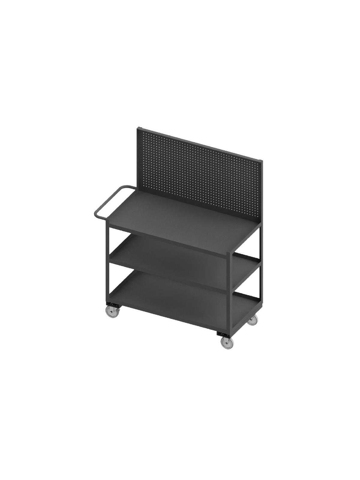 Frame is 1-1/2 x 1/8" angle iron for added strength. Rolls smoothly on 5" polyurethane bolt-on casters, (2) swivel with side brakes and (2) rigid. 1200 lbs. capacity. Pegboard holes are 1/4" diameter and punched on 1" centers. They accommodate standard peg hooks. (peg hooks are not included.) Louvered panels accommodate Hook-On-Bins®. 32 Hook-On-Bins® are included. Bin size is 4" x 7" x 3". Locking drawers, include locks and 2 keys. FOB Shipping Point.