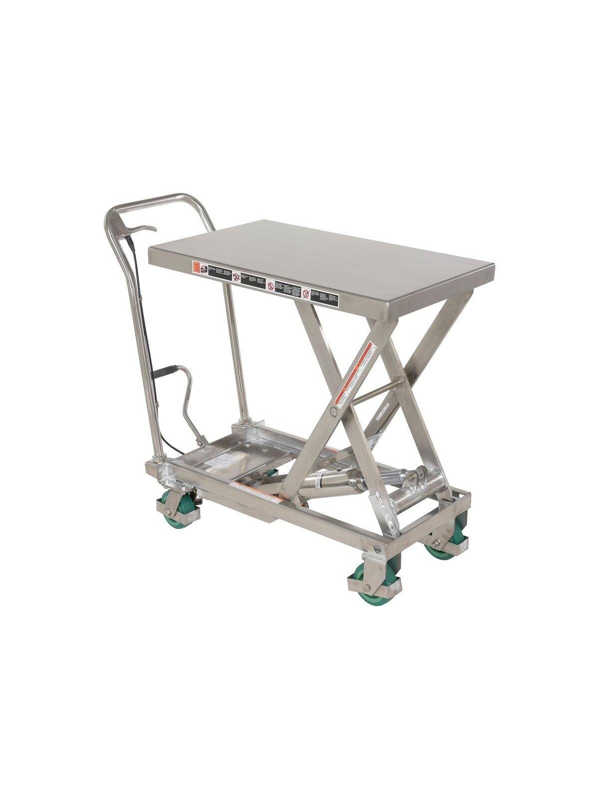 Our fully welded Stainless Steel Carts resist corrosion and wet environments. All parts are made from 304 or 316 grade stainless steel, including the hydraulic pump and foot pedal. These carts are suitable for most food, medical, and pharmaceutical industry settings. Also suitable for wash-down applications. 2 rigid and 2 swivel polyurethane wheels with brakes standard. Units feature a high quality actuated, single-speed hydraulic pump. FOB Shipping Point.
