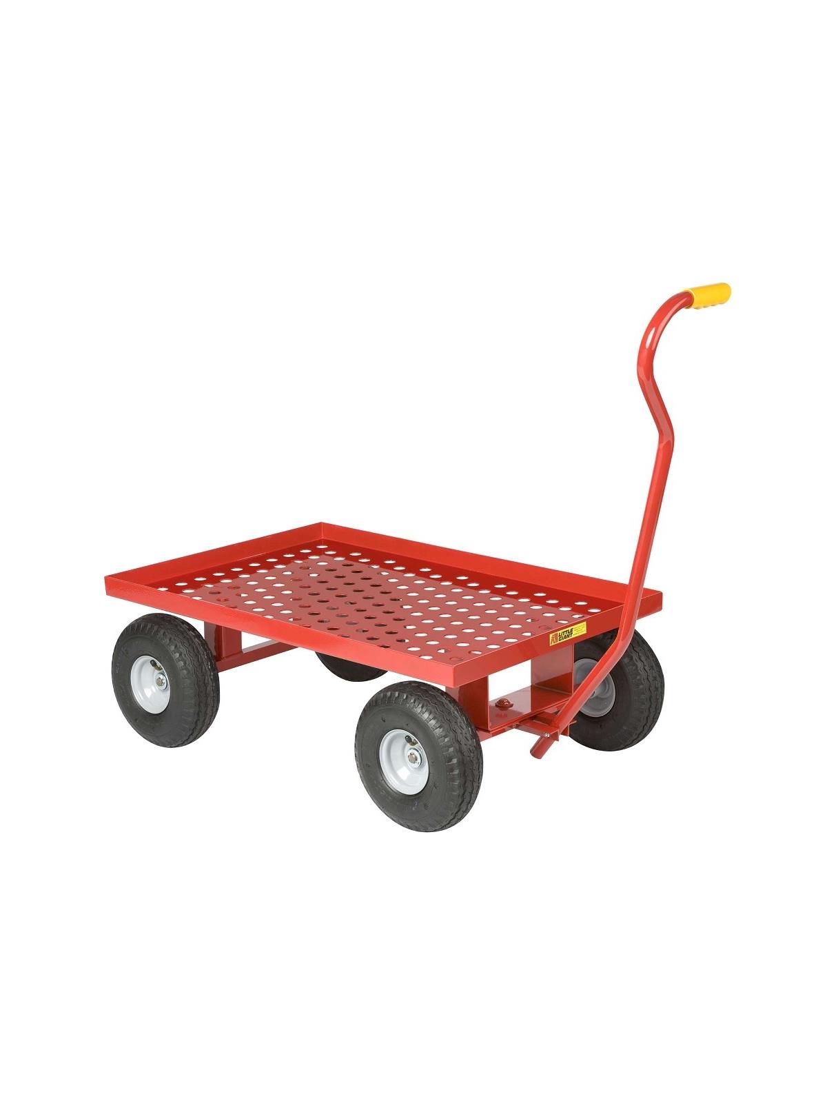 Choice of puncture proof rubber wheels, or pneumatic wheels. Pull handle has vinyl hand grip. Wagons have 1-1/2" retaining lip around the edges that help confine the load. Solid steel deck offers maximum durability. Perforated steel deck allows dirt and moisture to pass through. Deck size is 24" W x 36" L. Durable powder coat Red finish. Ships fully assembled via small package carrier. FOB Shipping Point.