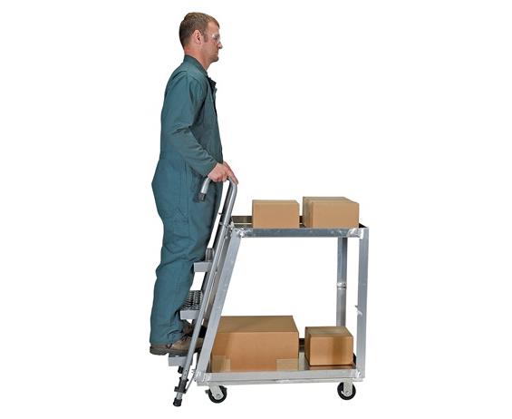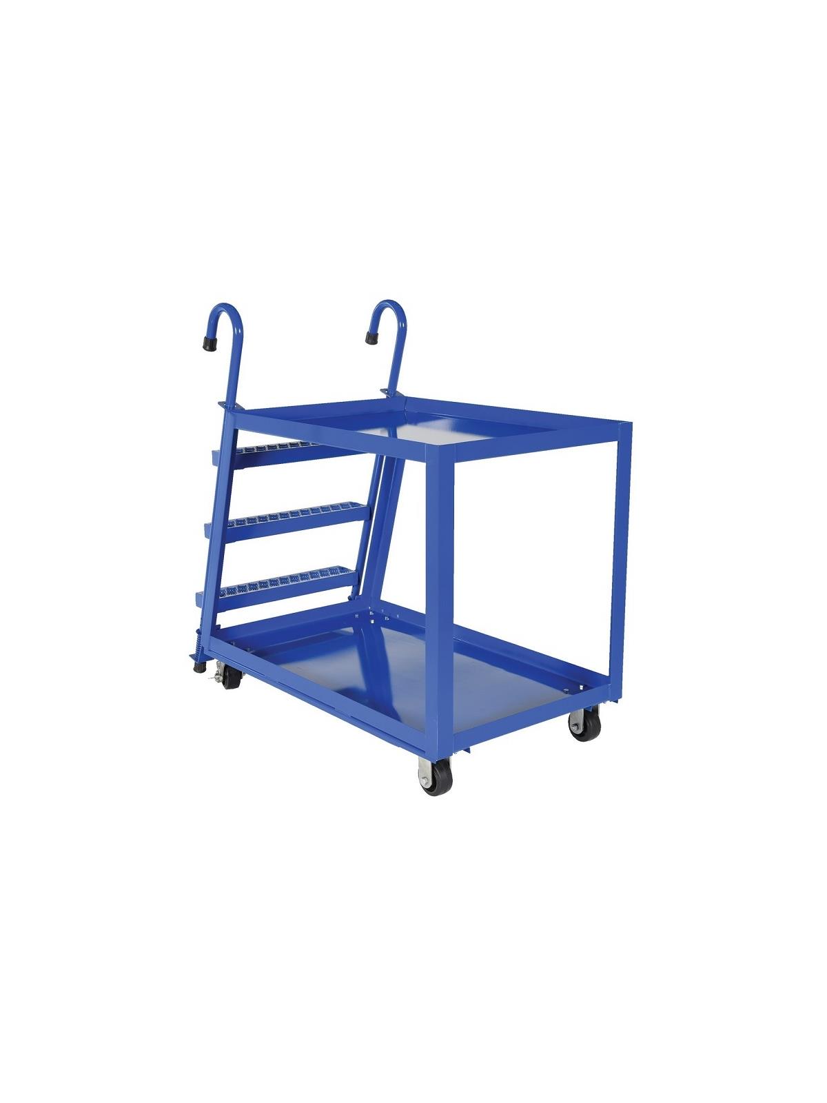 Stockpicker Trucks combine the mobility of a cart with the versatility of a steel step ladder. Spring loaded steel step ladder holds the cart securely in place while a person is standing on the ladder. Shelves have a 2" lip turned up. 4" x 1-1/2" mold-on rubber casters two (2) rigid and two (2) swivel with wheel brakes. Blue baked-in powder-coat finish for added toughness. Aluminum construction available. FOB Shipping Point.