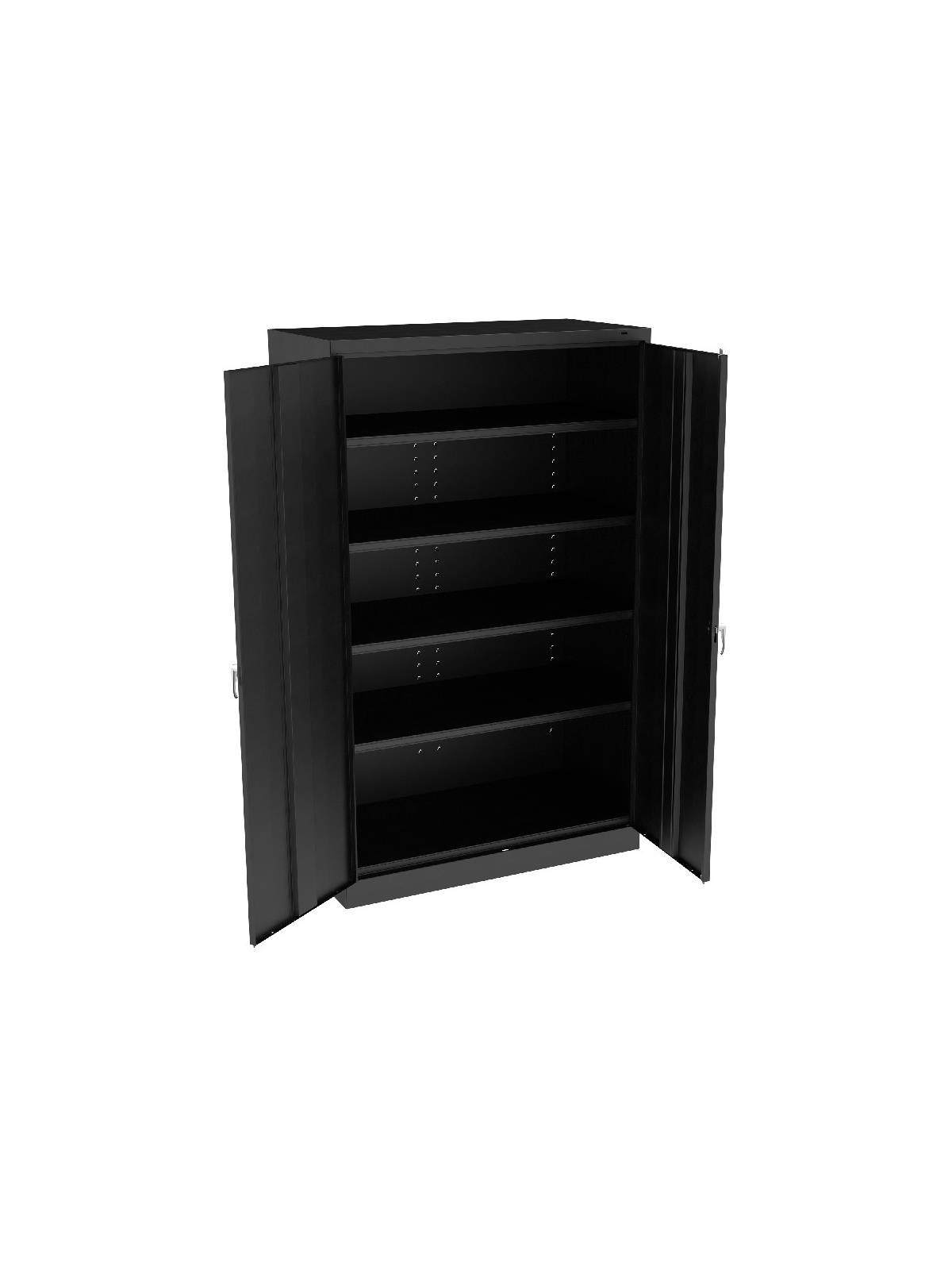 Jumbo size for jumbo storage capacity. Two front leveling glides compensate for uneven floors. Four leaf hinges on each door insure the integrity of the cabinet and the alignment of the doors. Handle on right-hand door activates a three-point locking system for added security -- second handle on left-hand door. Shelves are adjustable in 2" increments on built-in shelf tabs. Shelves hold up to 400 lbs. evenly distributed. Unassembled cabinets ship in 2 cartons. Available in Black, Champagne/Putty, Sand, Light Gray and Medium Gray. FOB Shipping Point.