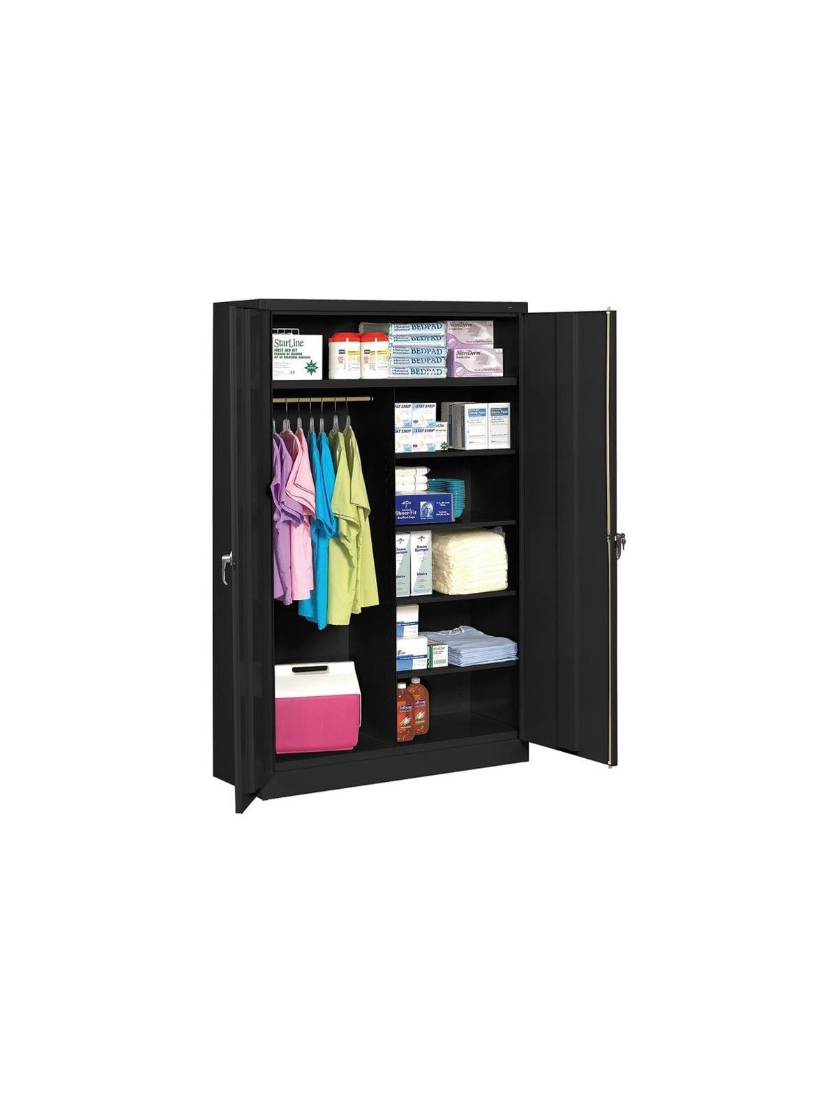 Jumbo size for jumbo storage capacity. Two front leveling glides compensate for uneven floors. Four leaf hinges on each door insure the integrity of the cabinet and the alignment of the doors. Handle on right-hand door activates a three-point locking system for added security -- second handle on left-hand door. Shelves are adjustable in 2" increments on built-in shelf tabs. Shelves hold up to 400 lbs. evenly distributed. Unassembled cabinets ship in 2 cartons. Available in Black, Champagne/Putty, Sand, Light Gray and Medium Gray. FOB Shipping Point.