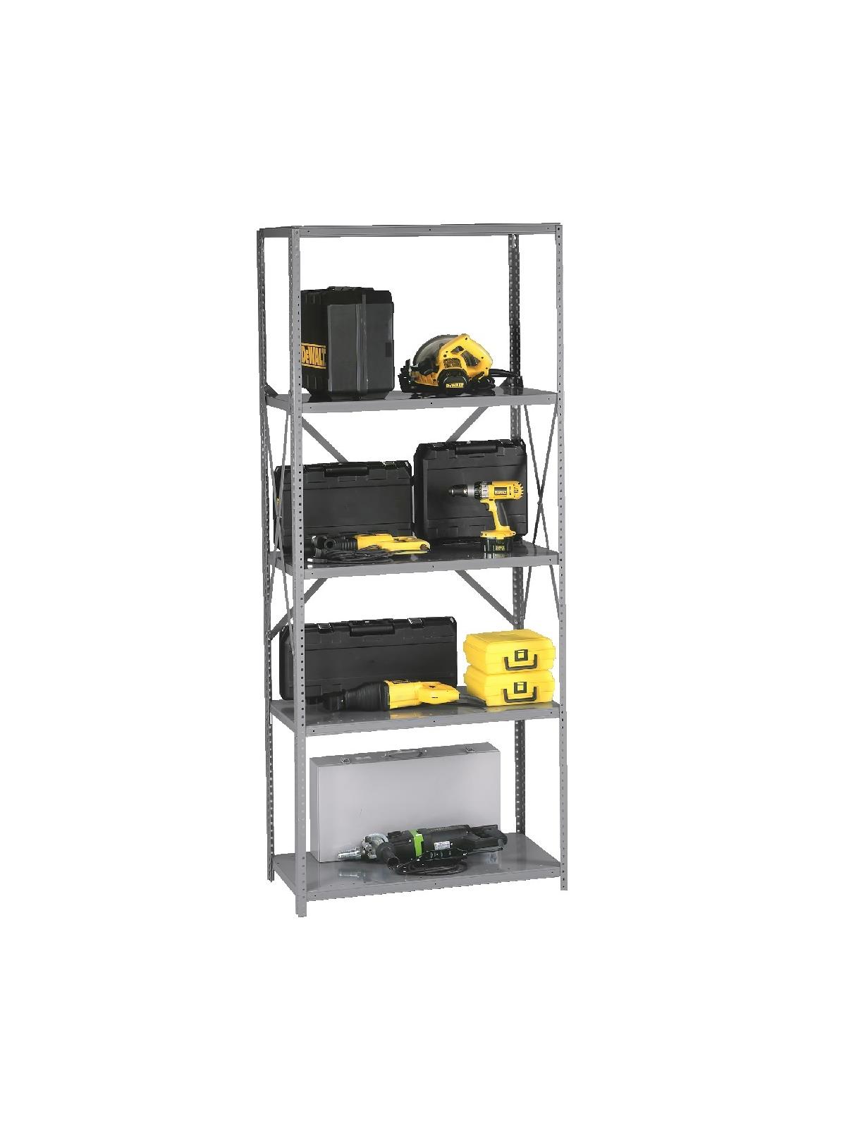 The unique shelf design has deep box-beam formations front and back, fully lapped and welded corners and double-ribbed outside surfaces on the box formation. In addition, the front and rear flange on the box beam is welded every 3". The result is load capacities that range all the way up to 1000 lbs. Shelves can be adjusted quickly and easily in 1" increments to make maximum use of vertical space. Five shelves including top and bottom shelves. Choose from open or closed units. Additional shelves are available as well as adjustable shelf dividers, shelf boxes and doors. Starter unit can be used individually or combined with adder units to form a row of shelving. Shipped unassembled. Medium gray finish. FOB Shipping Point.