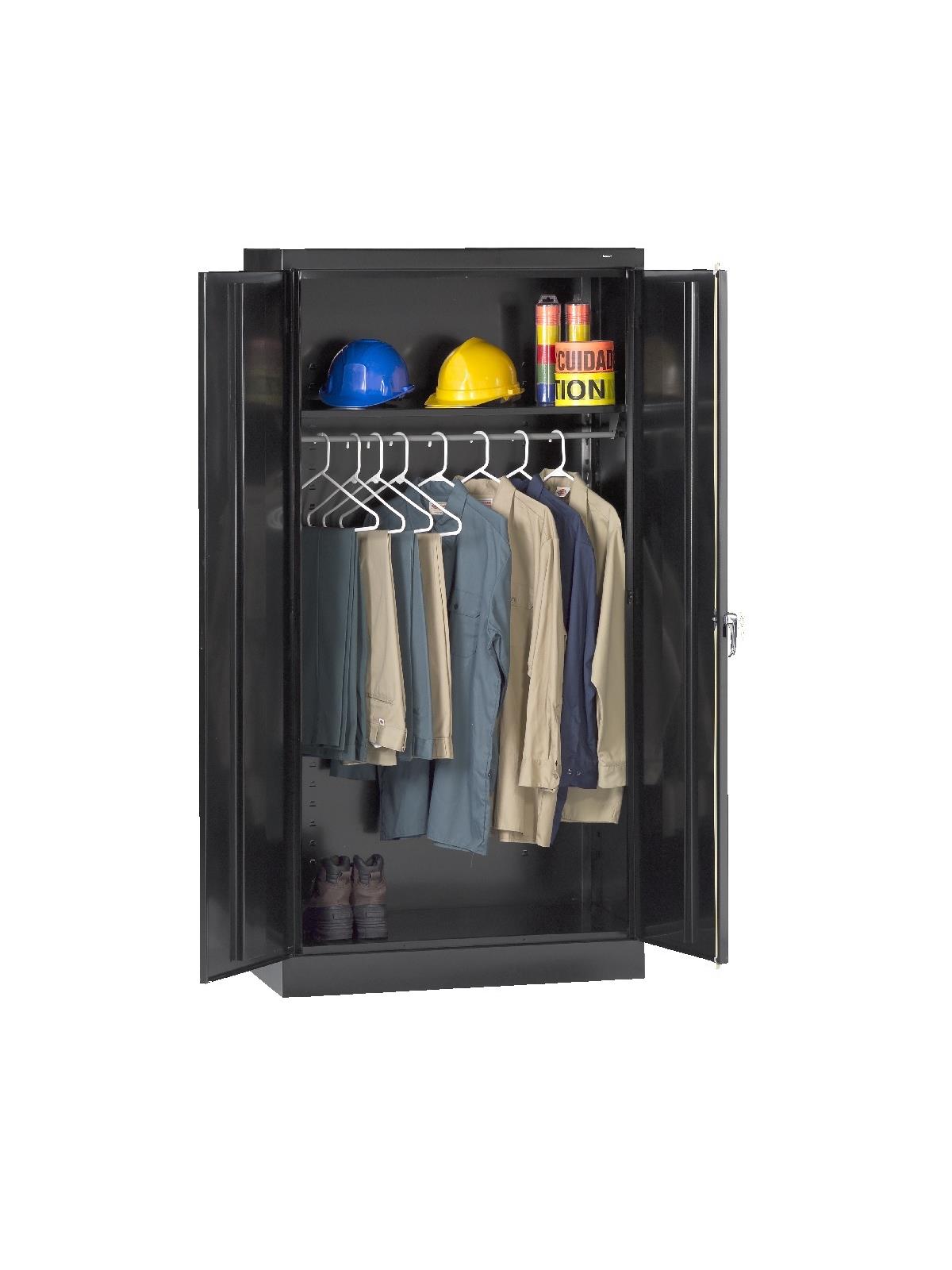 Shelves adjust in 2" increments. Heavy-steel construction with leaf hinges and reinforced doors stand up to a lifetime of heavy use. Handle on right-hand door activates the three-point locking system to keep belongings secure. Raised base keeps contents from contacting moisture from the floor. Available in 3 models--storage, wardrobe and combination. Available in Black, Champagne/Putty, Sand, Light Gray and Medium Gray. FOB Shipping Point.