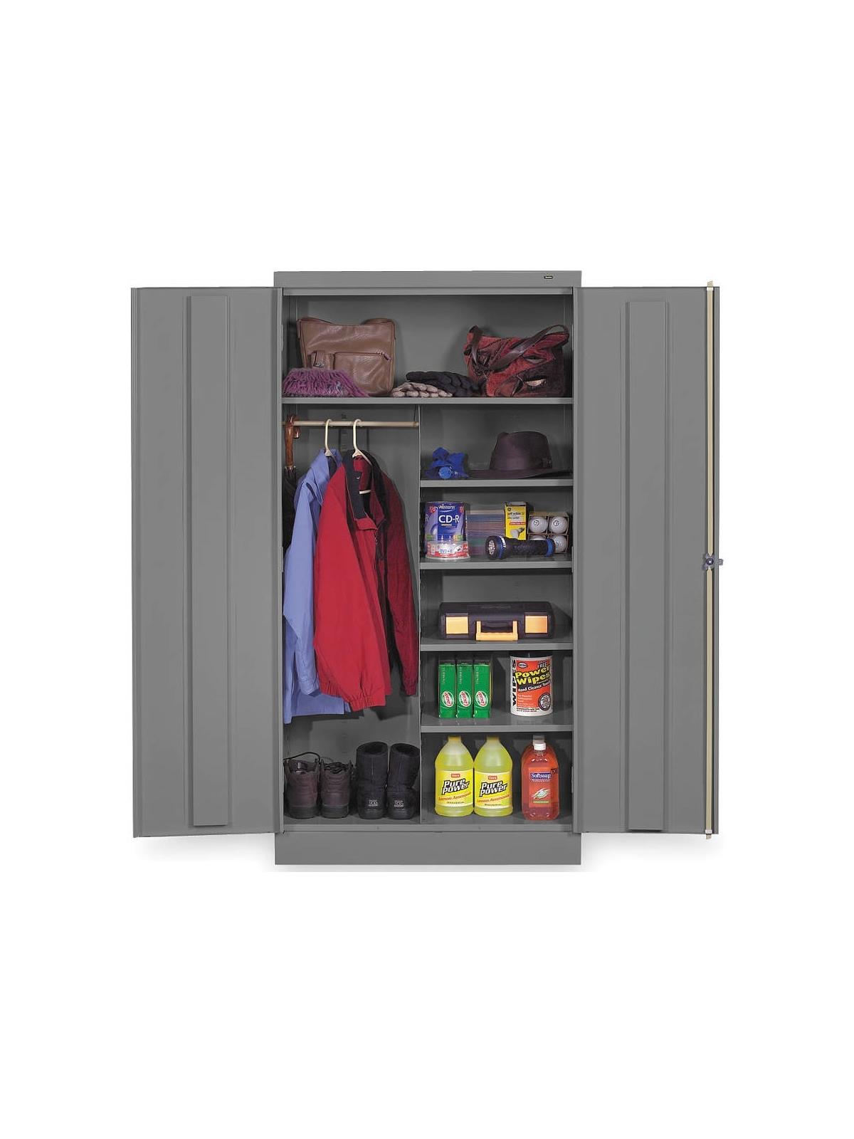 Shelves adjust in 2" increments. Heavy-steel construction with leaf hinges and reinforced doors stand up to a lifetime of heavy use. Handle on right-hand door activates the three-point locking system to keep belongings secure. Raised base keeps contents from contacting moisture from the floor. Available in 3 models--storage, wardrobe and combination. Available in Black, Champagne/Putty, Sand, Light Gray and Medium Gray. FOB Shipping Point.