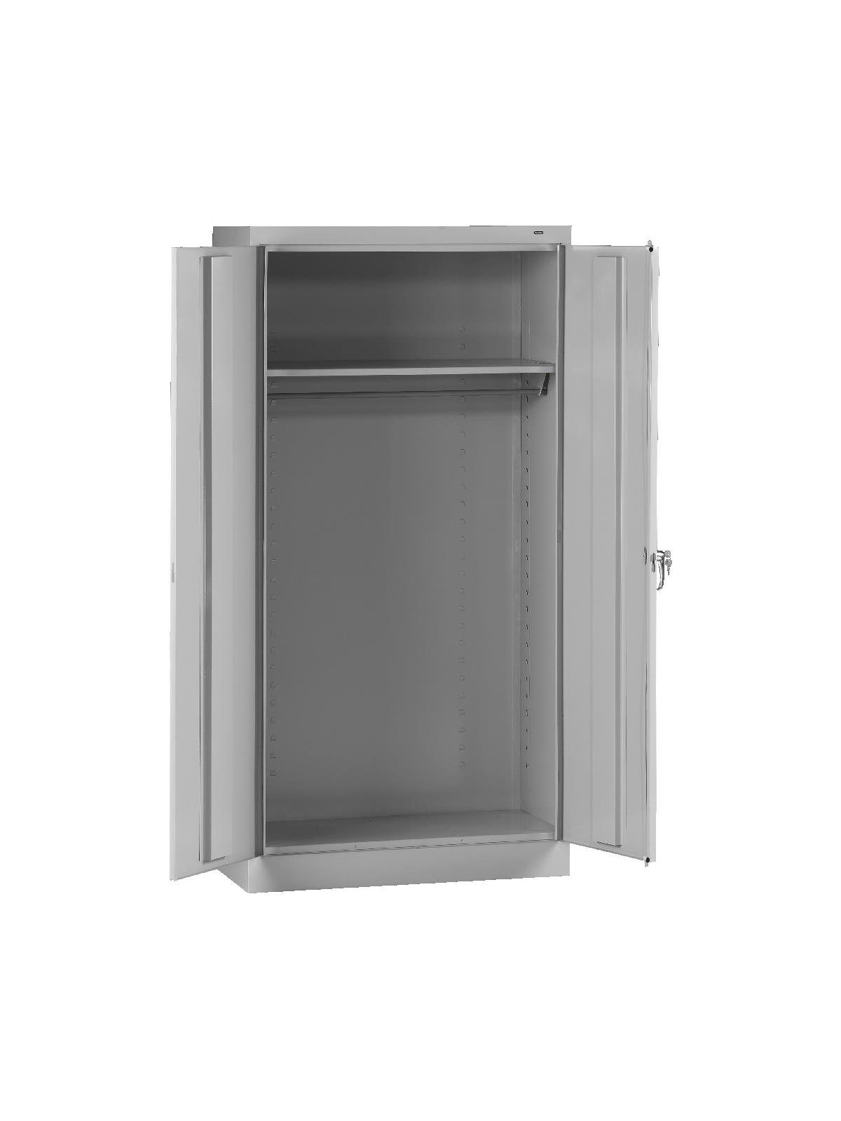 Shelves adjust in 2" increments. Heavy-steel construction with leaf hinges and reinforced doors stand up to a lifetime of heavy use. Handle on right-hand door activates the three-point locking system to keep belongings secure. Raised base keeps contents from contacting moisture from the floor. Available in 3 models--storage, wardrobe and combination. Available in Black, Champagne/Putty, Sand, Light Gray and Medium Gray. FOB Shipping Point.