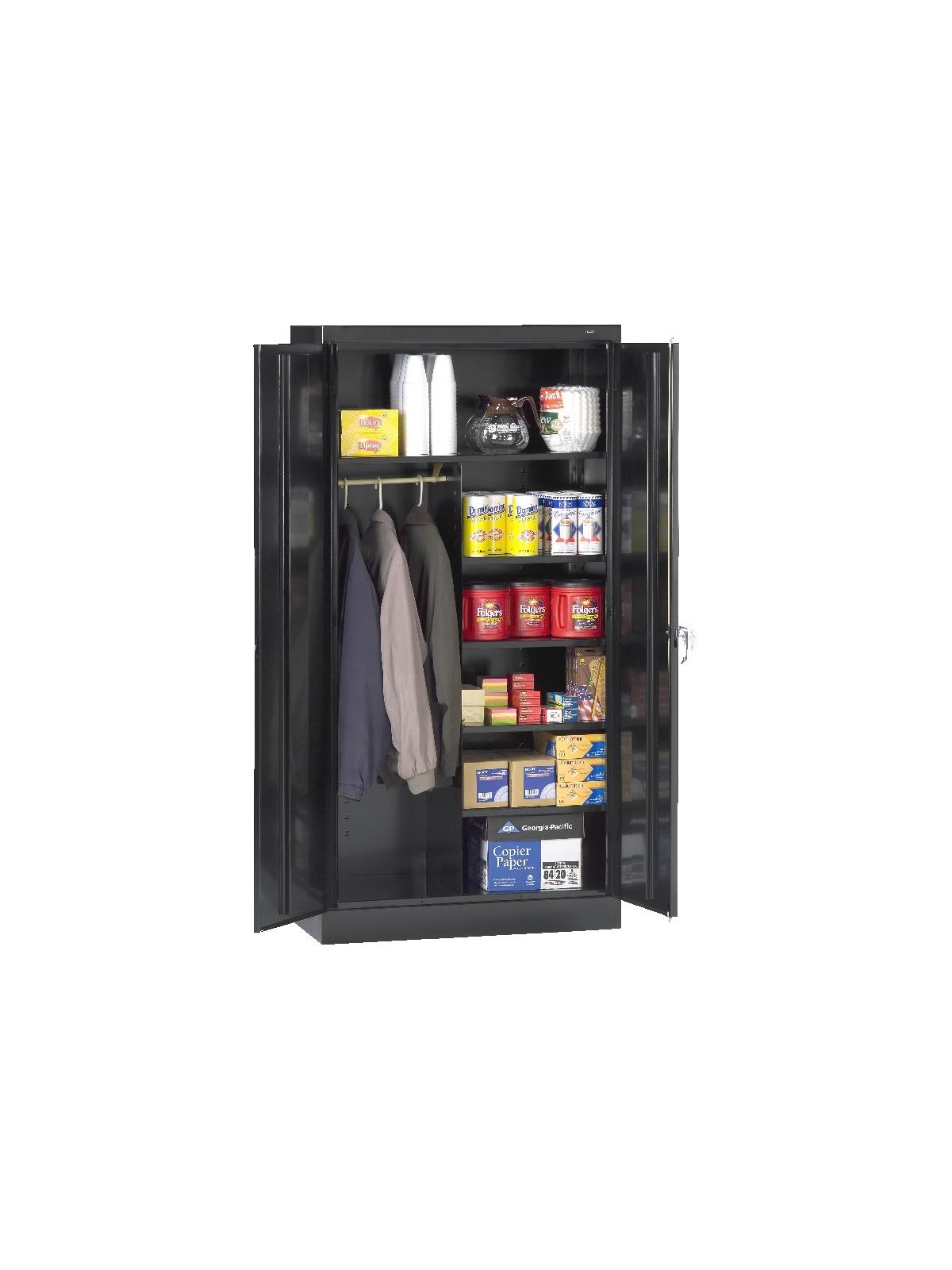 Shelves adjust in 2" increments. Heavy-steel construction with leaf hinges and reinforced doors stand up to a lifetime of heavy use. Handle on right-hand door activates the three-point locking system to keep belongings secure. Raised base keeps contents from contacting moisture from the floor. Available in 3 models--storage, wardrobe and combination. Available in Black, Champagne/Putty, Sand, Light Gray and Medium Gray. FOB Shipping Point.