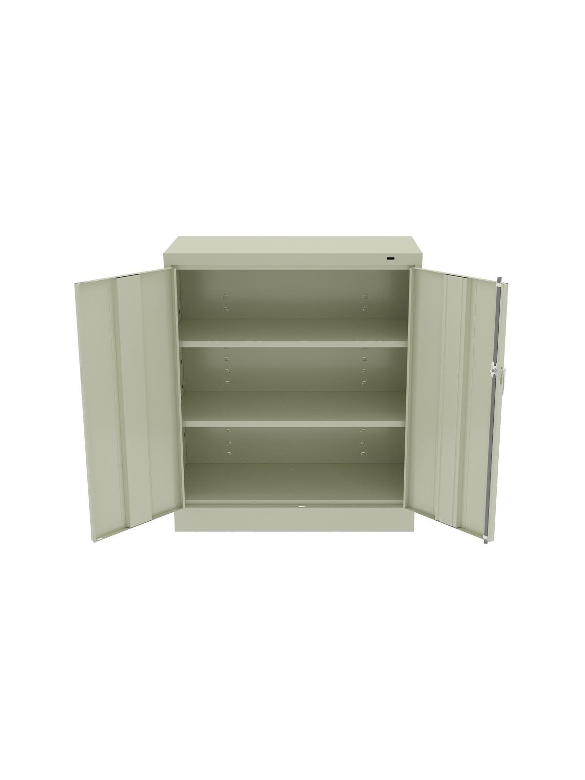 Shelves adjust in 2" increments. Heavy-steel construction with leaf hinges and reinforced doors stand up to a lifetime of heavy use. Handle on right-hand door activates the three-point locking system to keep belongings secure. Raised base keeps contents from contacting moisture from the floor. Available in Black, Champagne/Putty (shown), Sand, Light Gray and Medium Gray (shown). FOB Shipping Point.