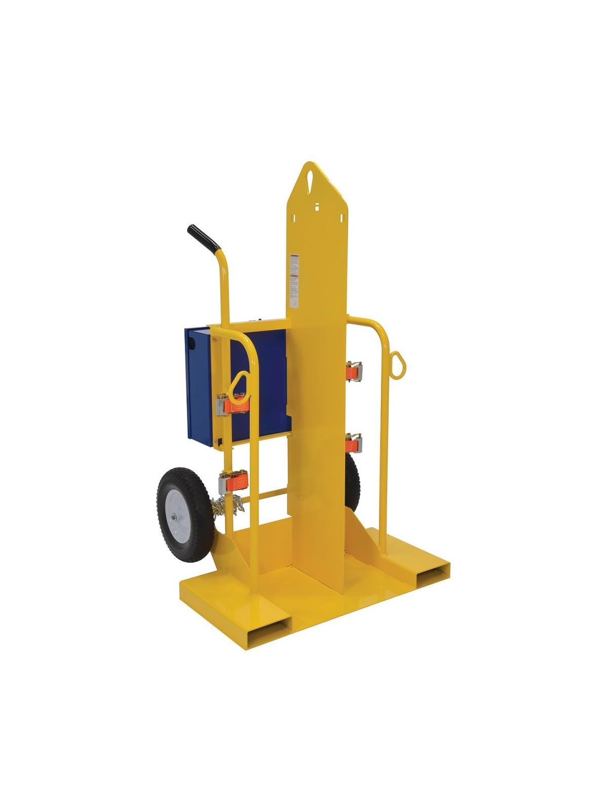 Designed for transporting cylinders and cutting torch. Includes two tank compartments with heavy-duty ratchet straps. Brackets are included for holding cutting torch and hose. Sturdy handles and large 16" diameter wheels for tilt-n-go portability. Heavy-duty uniform capacity rating is 500 lbs. HCYL-2 models include lockable storage box for regulators. Box includes hose opening so regulator does not need to be disconnected for storage. Lifting eye is 2" max. diameter, material thickness is 7/16". Usable size of each fork pocket is 7-1/2"W x 2-9/16"H. Units with fire protection include 1/2" (approximately 13mm) marinite 1 material, which provides a 30 minute fire protection barrier as described by OSHA standards 1910.253 and 1926.350. All units include cutting torch box, overhead lifting eye, and fork pockets. FOB Shipping Point.